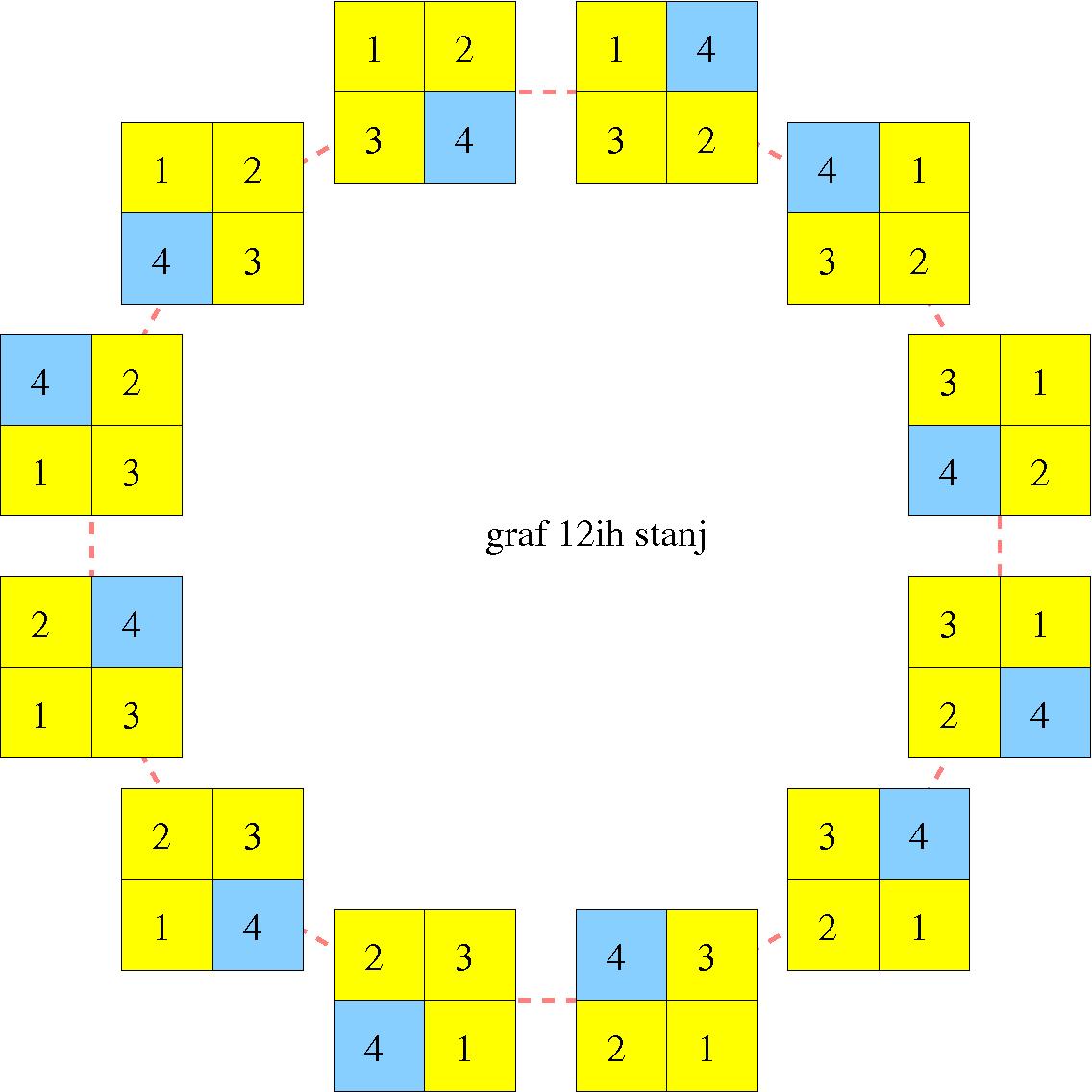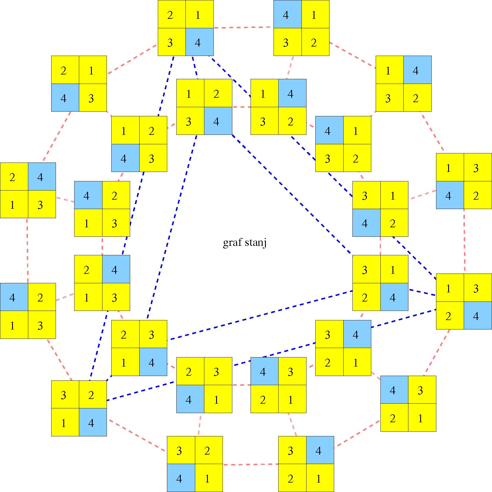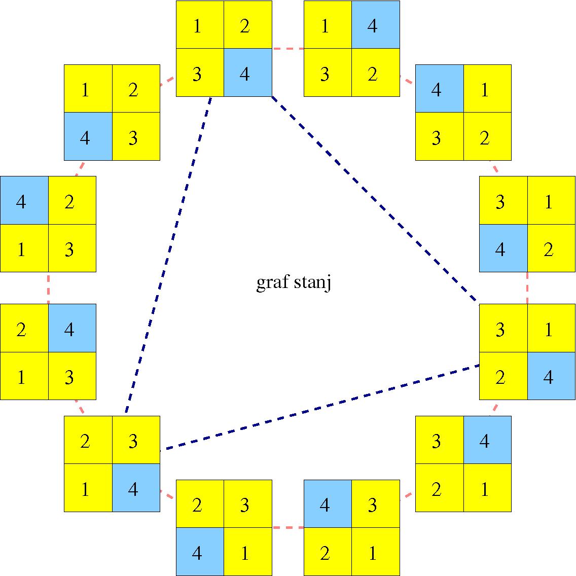 Morda igro bolje razumemo, če si narišemo graf stanj, če seveda le-teh ni preveč (med dvema stanjema vzpostavimo povezavo, če obstaja premik iz enega stanja v drugega, v našem primeru je premik, da potegnemo ploščico na prazno polje ali da obrnemo spodnjo oz. zgornjo kocko). V ta namen posplošimo igro na m stolpcev (na valju) in n vrstic (1. in zadnjo lahko ciklično zamaknemo + transpozicije s praznim poljem (na sliki modro).