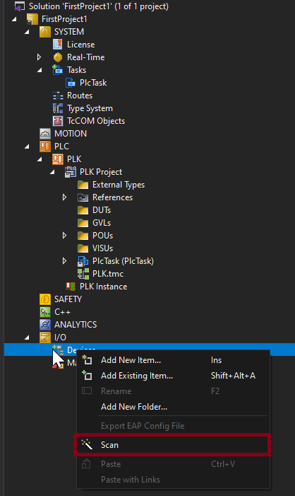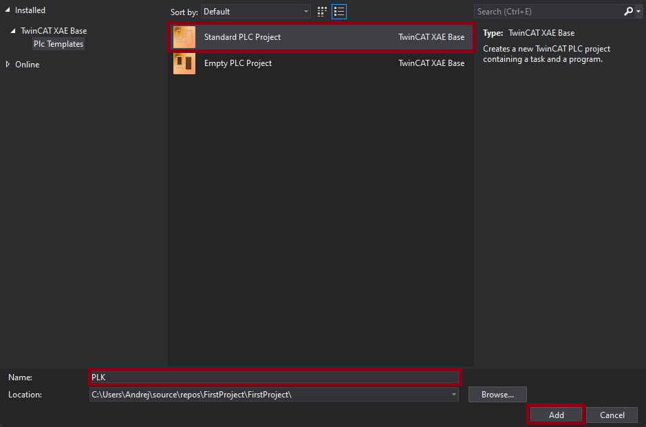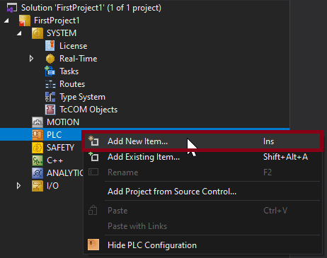 PLCsubfolder to open the menu, where you clickAdd New Item.... SelectStandard PLC Project, specify the project name, and clickAdd.