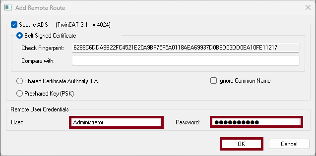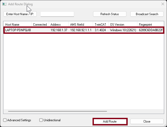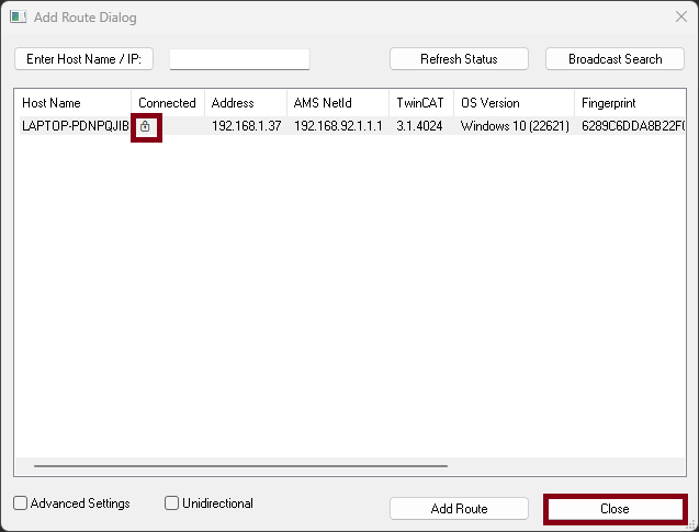 Add Routebutton. A window will open where you enter the username and password. The username isAdministrator, and the password isavtomatika. Once successfully connected to the controller, a lock icon will appear next to the name, and then clickClose.