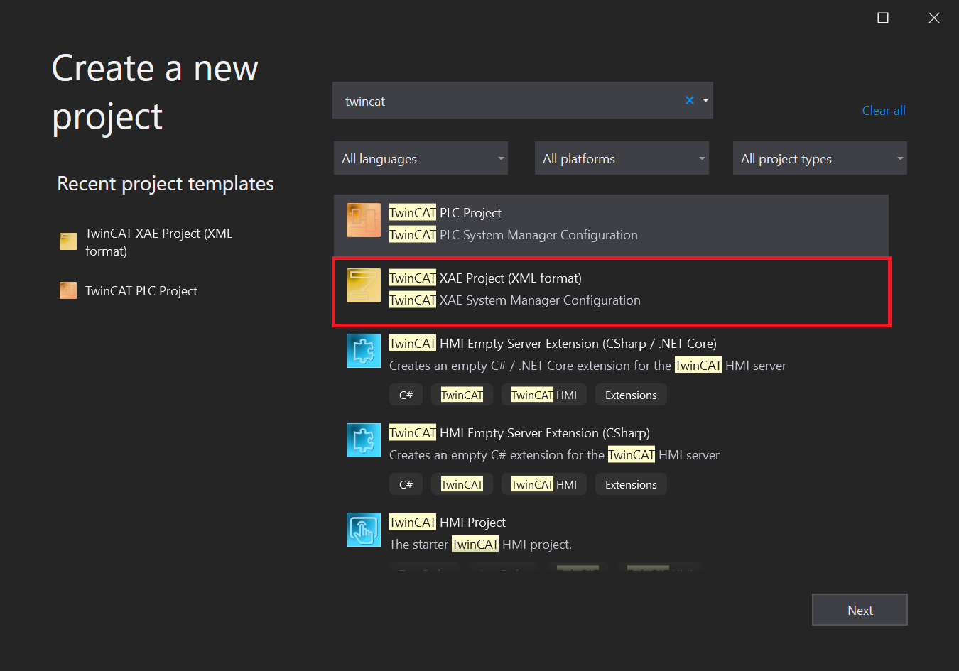 Create a new projectdialog, selectTwinCAT XAE Projectand clickNext. - Then, specify the project name and click