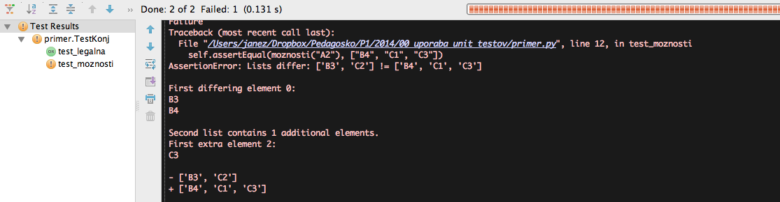 Izpis na desni strani pravi, da je pri testu self.assertEqual(moznosti("A2"), ["B4", "C1", "C3"]) prišlo do napake, saj ['B3', 'C2'] (kar funkcija vrne) ni isto kot ['B4', 'C1', 'C3'] (kar bi morala vrniti).